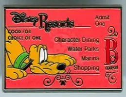 Pluto - B Ticket - Disney Resorts is a Limited Edition (LE) 750 pin from the Cast Pin Parties - Ticket Book Series pin series. It was originally released on , 2005 and was available from Walt Disney World .