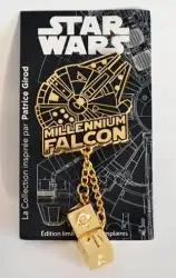 Millennium Falcon with Dice is a Limited Edition (LE) 500 pin from the Star Wars Collection Inspired by Patrice Girod pin series. It was originally released on , 2019 and was available from Disneyland Resort Paris .