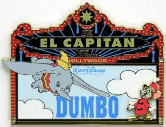 Dumbo is a Limited Edition (LE) 150 pin from the El Capitan Marquee Series pin series. It was originally released on , 2010 and was available from Disney Studio Store Hollywood / Soda Fountain .