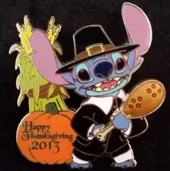 2013 - Happy Thanksgiving - Pilgrim Stitch with Drumstick is a Limited Edition (LE) 3000 pin from the Thanksgiving pin series. It was originally released on , 2013 and was available from Multiple Sources (WDW, DLR, etc.).