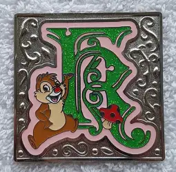 Dale (Green Glitter and Pink Filigree Letter E) is an Open Edition pin from the I Love Mickey & Minnie Mystery Tin Collection pin series. It was originally released in January, 2013 and was available from Hong Kong Disneyland .