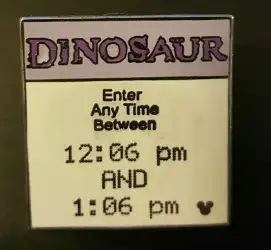 Dinosaur is a Limited Release pin from the Cast Lanyard Series IV - FastPass Tickets pin series. It was originally released in January, 2006 and was available from Walt Disney World .
