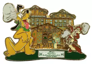 Grand Californian - Pluto with Chip and Dale is a Limited Edition (LE) 1500 pin from the Gingerbread House Collection 2015 pin series. It was originally released on , 2015 and was available from Disneyland Resort .