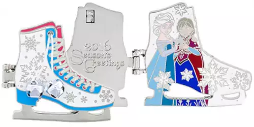 Anna and Elsa Ice Skates is a Limited Edition (LE) 6000 pin from the Season's Greetings Ice Skates pin series. It was originally released on , 2016 and was available from Multiple Sources (WDW, DLR, etc.).