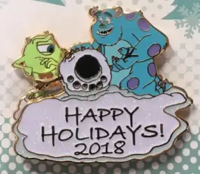 Mike and Sulley is a Limited Edition (LE) 3500 pin from the Happy Holidays 2018 pin series. It was originally released on , 2018 and was available from Multiple Sources (WDW, DLR, etc.).