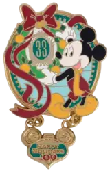 2009 - Mickey with Wreath is a Limited Edition (LE) 1000 pin from the Club 33: Happy Holidays Dangle Series pin series. It was originally released on , 2009 and was available from Disneyland Resort .