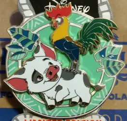 Hei Hei and Pua is a Limited Edition (LE) 300 pin from the Moana pin series. It was originally released on , 2016 and was available from Disney Studio Store Hollywood / Soda Fountain .