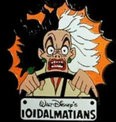 101 Dalmatians 1961 - Cruella Driving is a Limited Edition (LE) 2000 pin from the History of Art - 101 Dalmatians pin series. It was originally released on , 2002 and was available from an Officially Licensed Disney trading pin vendor (see description for more information).