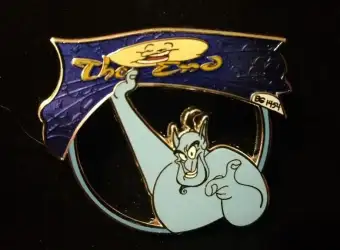 Genie with The End Curtain SUPER CHASER is a Limited Edition (LE) 200 pin from the Aladdin 25th Anniversary Mystery Collection pin series. It was originally released on , 2017 and was available from Multiple Sources (WDW, DLR, etc.).