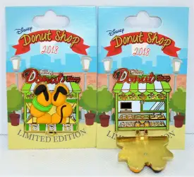 Pluto is a Limited Edition (LE) 3000 pin from the Disney Donut Shop Series pin series. It was originally released on , 2018 and was available from Multiple Sources (WDW, DLR, etc.).