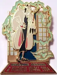 Cruella Welcome Aboard is a Limited Edition (LE) 750 pin from the A Villainous Pin Voyage pin series. It was originally released on , 2004 and was available from Disney Cruise Line .