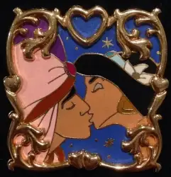 Aladdin and Jasmine is an Open Edition pin from the The Kiss pin series. It was originally released on , 2004 and was available from Multiple Sources (WDW, DLR, etc.).