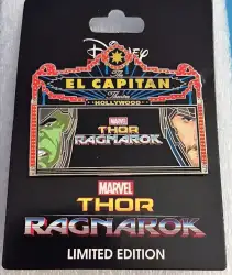Thor Ragnarok is a Limited Edition (LE) 300 pin from the El Capitan Marquee Series pin series. It was originally released on , 2017 and was available from Disney Studio Store Hollywood / Soda Fountain .