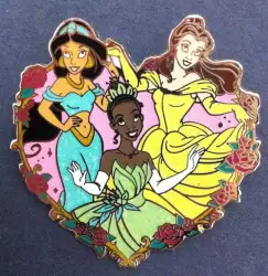 Jasmine, Belle, and Tiana in Floral Heart is an Open Edition pin. It was originally released on , 2011 and was available from Multiple Sources (WDW, DLR, etc.).