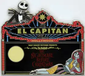 The Nightmare Before Christmas #6 Jack & Sally is a Limited Edition (LE) 300 pin from the El Capitan Marquee Series pin series. It was originally released on , 2009 and was available from Disney Studio Store Hollywood / Soda Fountain .