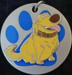 Dug is a Limited Edition (LE) 400 pin from the Dog Collar Tag Collection pin series. It was originally released on , 2014 and was available from Disney Studio Store Hollywood / Soda Fountain .