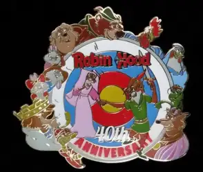 40th Anniversary is a Limited Edition (LE) 400 pin from the Robin Hood pin series. It was originally released on , 2013 and was available from Disney Studio Store Hollywood / Soda Fountain .