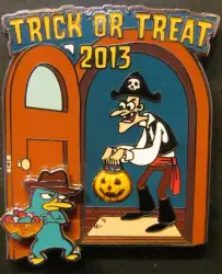 Agent P (Perry) and Dr. Doofenshmirtz Trick or Treat is a Limited Edition (LE) 3000 pin from the Halloween 2013 pin series. It was originally released in October, 2013 and was available from Multiple Sources (WDW, DLR, etc.).