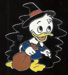 Dewey dressed as a Pilgrim is a Limited Release pin from the 2007 Hidden Mickey - Trick or Treat pin series. It was originally released in October, 2007 and was available from Disneyland Resort .