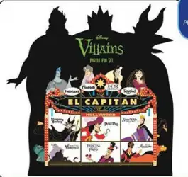 Villains is a Limited Edition (LE) 400 pin from the Villains Marquee 9 Piece Puzzle Set pin series. It was originally released on , 2015 and was available from Disney Studio Store Hollywood / Soda Fountain .