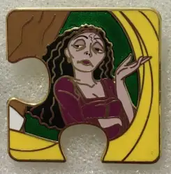 Mother Gothel is a Limited Edition (LE) 900 pin from the Character Connection Mystery Collection - Tangled Puzzle pin series. It was originally released on , 2018 and was available from Multiple Sources (WDW, DLR, etc.).