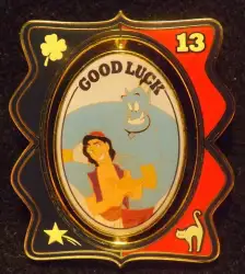Aladdin is a Limited Edition (LE) 600 pin from the Good Luck, Bad Luck Spinner Series pin series. It was originally released on , 2013 and was available from Disneyland Resort Paris .