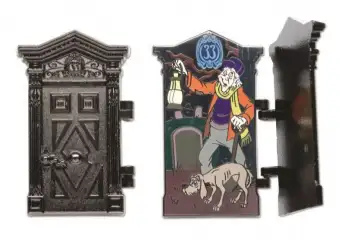 Caretaker and Dog is a Limited Edition (LE) 999 pin from the The Haunted Mansion 50th Anniversary - Club 33 Hinged Doors Collection pin series. It was originally released on , 2019 and was available from Disneyland Resort .