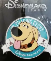Dug is a Limited Edition (LE) 425 pin from the Up Mon Livre Adventure Event pin series. It was originally released on , 2019 and was available from Disneyland Resort Paris .