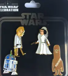 Pin features Luke Skywalker , Princess Leia , Chewbacca and R2-D2