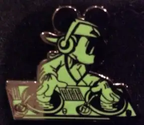 DJ Mickey is an Open Edition pin in the Hipster Full Set 7-pin set from the Hipster Themed D-Tour Mini Pin Set pin series. It was originally released on , 2013 and was available from Multiple Sources (WDW, DLR, etc.).