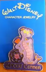 Figment Leaning on Old Epcot Center Logo is an Open Edition pin from the Figment pin series. It was available from Walt Disney World .