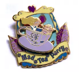 Alice and the Cheshire Cat ride the Mad Tea Party Attraction is an Open Edition pin from the Mad Tea Party pin series. It was originally released on , 2010 and was available from Multiple Sources (WDW, DLR, etc.).