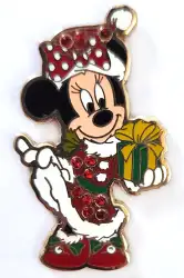 Jeweled Christmas Minnie Holding a Present is an Open Edition pin from the Christmas 2008 pin series. It was originally released on , 2008 and was available from Multiple Sources (WDW, DLR, etc.).
