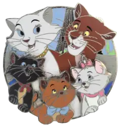 Pin features Duchess , Marie , Thomas O'Malley , Toulouse and Berlioz from The Aristocats