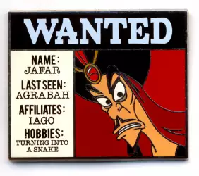 Jafar is a Limited Edition (LE) 500 pin from the Cast Member Exclusive - Wanted Collection pin series. It was originally released on , 2017 and was available from Theme Park Cast Member Exclusive .