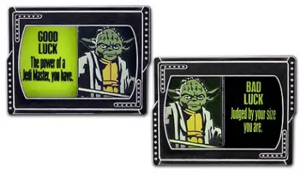 Yoda is a Limited Edition (LE) 1000 pin from the Good Luck, Bad Luck Slider Series pin series. It was originally released on , 2013 and was available from Walt Disney World .