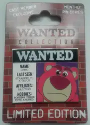 Lotso is a Limited Edition (LE) 500 pin from the Cast Member Exclusive - Wanted Collection pin series. It was originally released on , 2017 and was available from Theme Park Cast Member Exclusive .