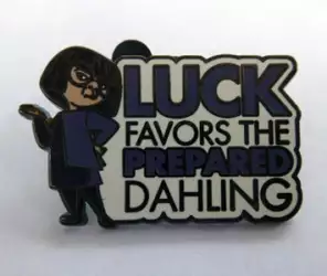 Luck Favors the Prepared Dahling is an Open Edition pin from the The Incredibles Mystery Collection pin series. It was originally released on , 2019 and was available from Multiple Sources (WDW, DLR, etc.).