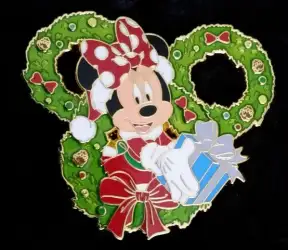 Minnie is a Limited Release pin from the 2014 Happy Holidays Wreath Mystery Collection pin series. It was originally released on , 2014 and was available from Multiple Sources (WDW, DLR, etc.).