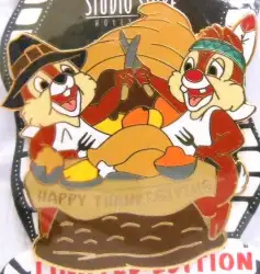 Chip and Dale is a Limited Edition (LE) 300 pin from the Thanksgiving pin series. It was originally released on , 2010 and was available from Disney Studio Store Hollywood / Soda Fountain .