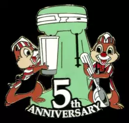 Chip & Dale Lanyard Milkshake pin is a Limited Edition (LE) 300 pin from the 5th Anniversary Pin Trading Event pin series. It was originally released on , 2010 and was available from Disney Studio Store Hollywood / Soda Fountain .