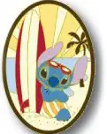 Stitch is a Limited Edition (LE) 300 pin from the Retro Surf pin series. It was originally released on , 2011 and was available from Disney Studio Store Hollywood / Soda Fountain .