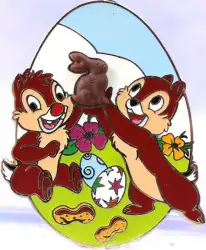 Chip and Dale is a Limited Edition (LE) 300 pin from the Easter 2011 pin series. It was originally released on , 2011 and was available from Disney Studio Store Hollywood / Soda Fountain .