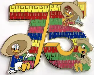 The Three Caballeros 75th Anniversary - Donald Duck, Jose Carioca and Panchito is a Limited Edition (LE) 200 pin from the The Three Caballeros Anniversaries pin series. It was originally released on , 2020 and was available from Disney Studio Store Hollywood / Soda Fountain .