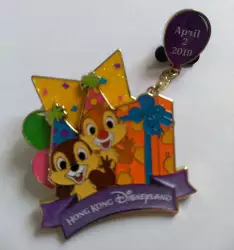 2019 - Chip & Dale Birthday Present and Chained Balloon is a Limited Edition (LE) 600 pin from the HKDL Character Birthdays pin series. It was originally released on , 2019 and was available from Hong Kong Disneyland .