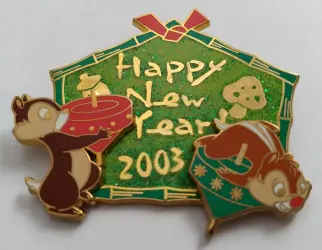 Happy New Year 2003 - Chip & Dale is a Limited Edition (LE) 1500 pin from the New Year's Eve/Day pin series. It was originally released on , 2002 and was available from an Officially Licensed Disney trading pin vendor (see description for more information).