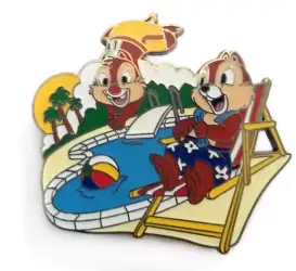 Chip & Dale Swimming is a Limited Edition (LE) 300 pin from the Summer 2012 pin series. It was originally released on , 2012 and was available from Disney Studio Store Hollywood / Soda Fountain .