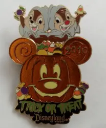 Chip and Dale Pop-Up Pumpkin is a Limited Edition (LE) 1000 pin from the Trick or Treat 2010 pin series. It was originally released on , 2010 and was available from Disneyland Resort .
