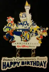 Cast Exclusive - Happy Birthday to the Contemporary Hotel is a Limited Edition (LE) 1000 pin from the Walt Disney World 30th Anniversary pin series. It was originally released in January, 2001 and was available from Walt Disney World .