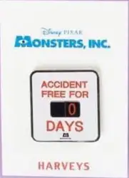 Accident Free is a Limited Release pin from the Harveys California - Monster's Inc. pin series. It was originally released on , 2020 and was available from an Officially Licensed Disney trading pin vendor (see description for more information).